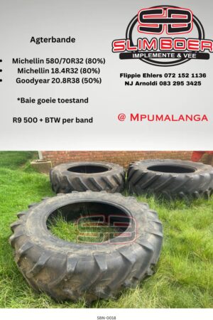Michellin 580/70R32 (80%), Michellin 18.4R32 (80%), Goodyear 20.8R38 (50%) Baie goeie toestand