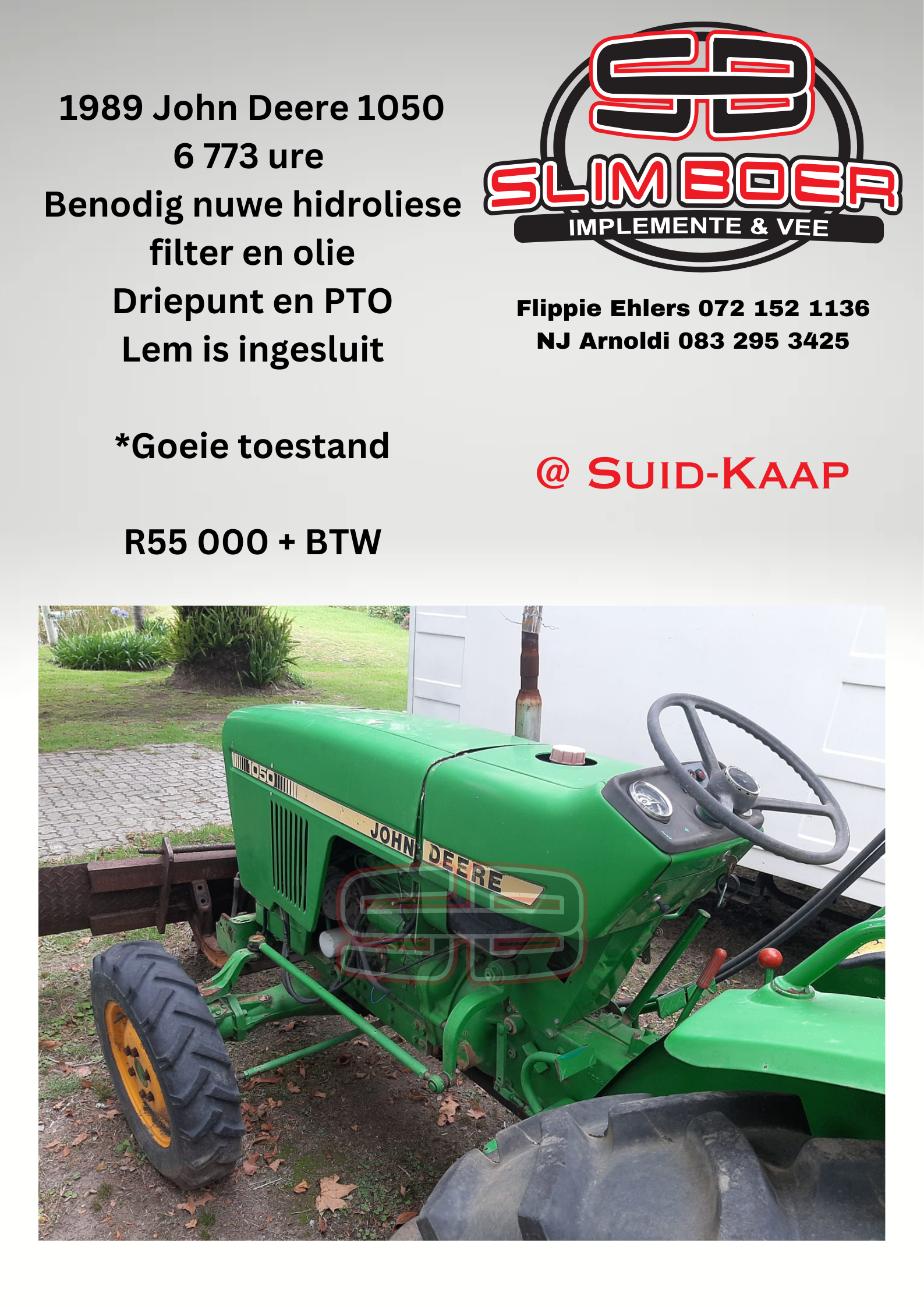 1989 John Deere 1050 met 6773 ure benodig nuwe hidroliese filter en olie Driepunt en PTO Lem ingesluit
