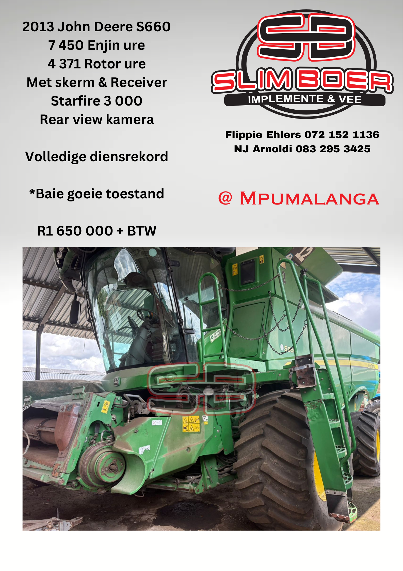 2013 John Deere S660 met skerm, receiver & rear view kamera
