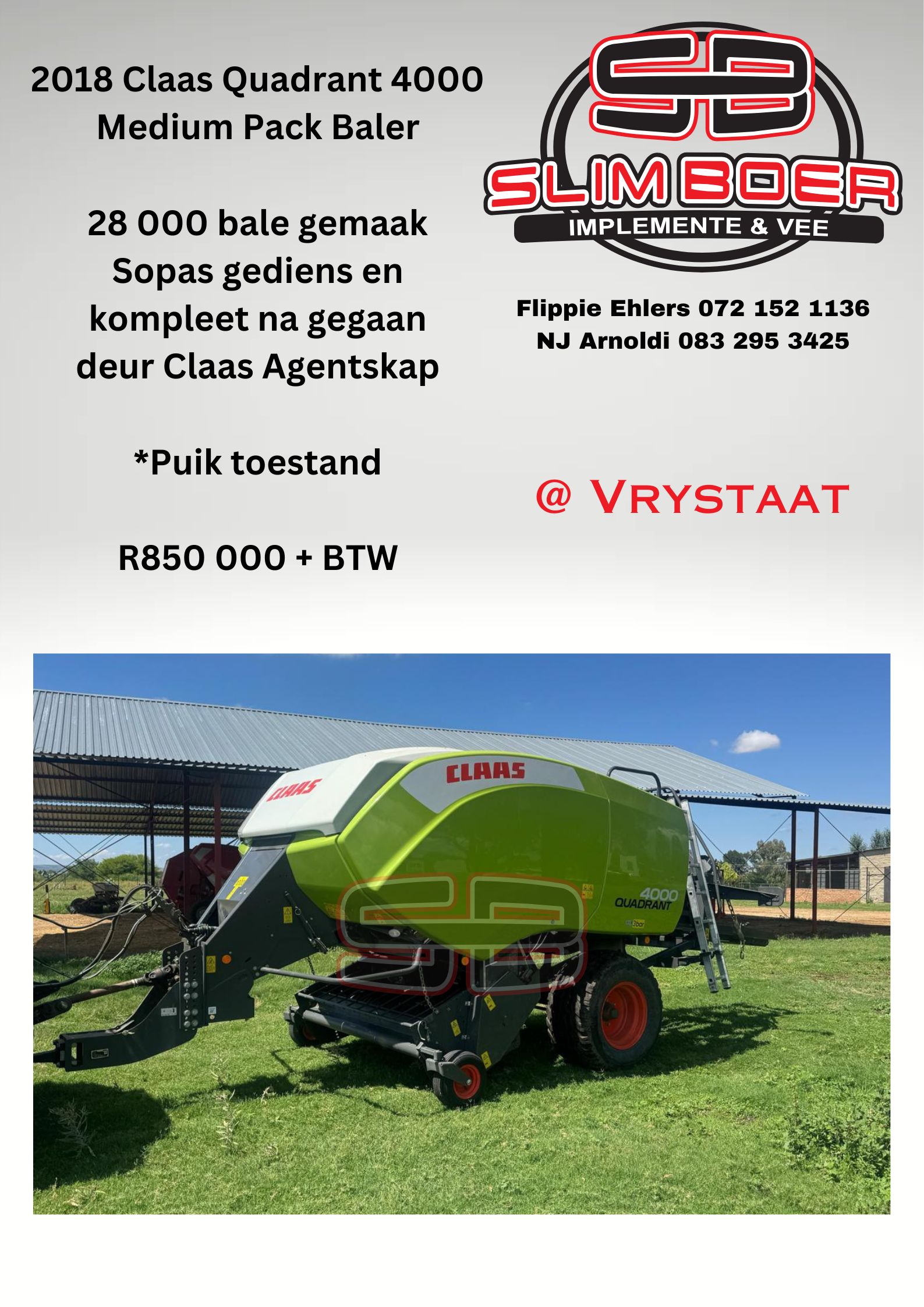 2018 Claas Quadrant 4000, Medium Pack Baler, 28 000 bale gemaak, Sopas gediens deur agent