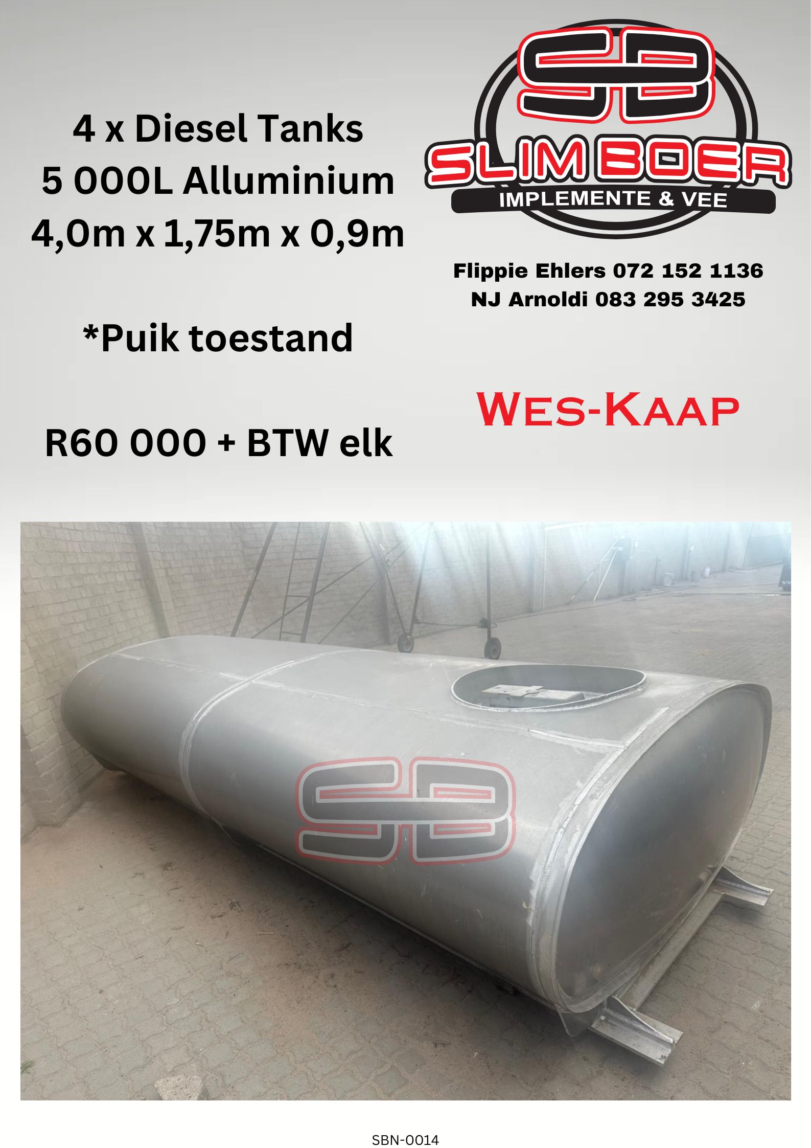 4 x Diesel Tanks, 5,000Lt, Alluminium, 4m x 1.75m x 0.9m, Puik toestand
