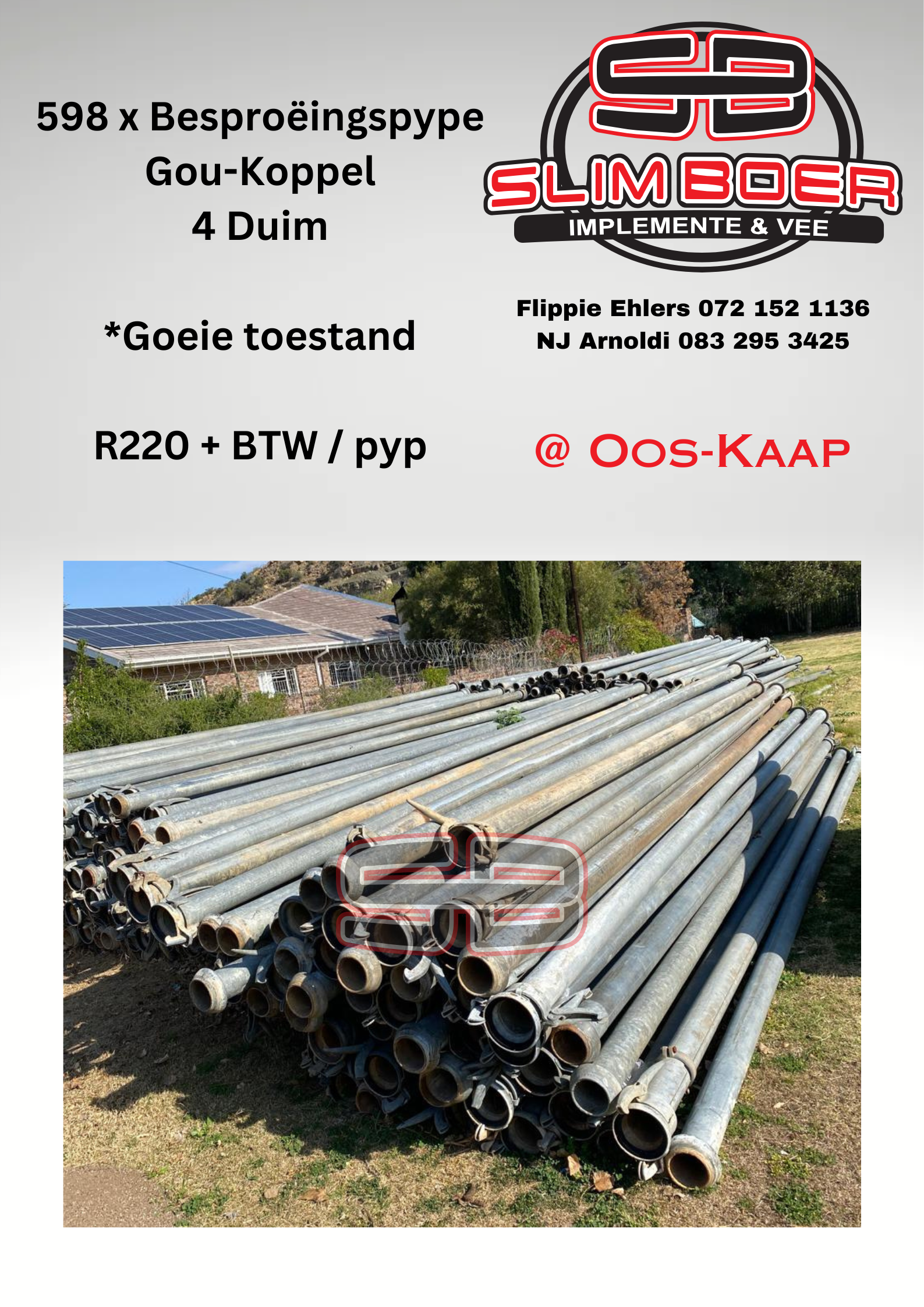 598 x Besproeingspype, gou-Koppel, 4 Duim, goeie toestand (Prys per Pyp)