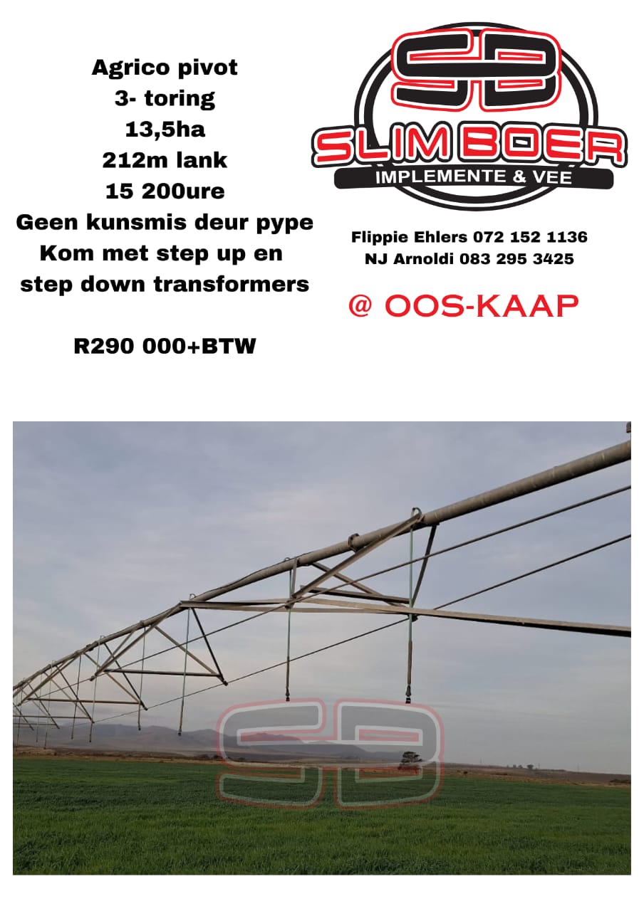 Agrico Pivot 3 Toring 13,5 Ha, 212m lank, 15,200 ure, geen kunsmis deur pype, Kom met step-up en step-down transformer
