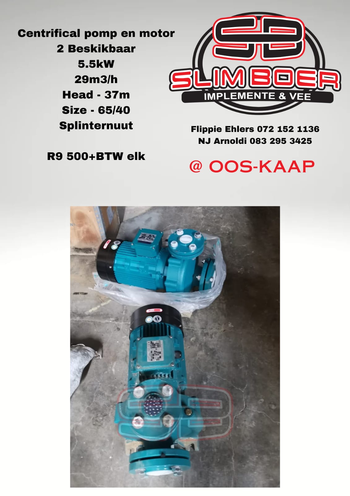 Centrifical pomp en motor. 2 beskikbaar. 5.5kW, 29m3/h, Head-37m, Size-65/40 (Nuut)