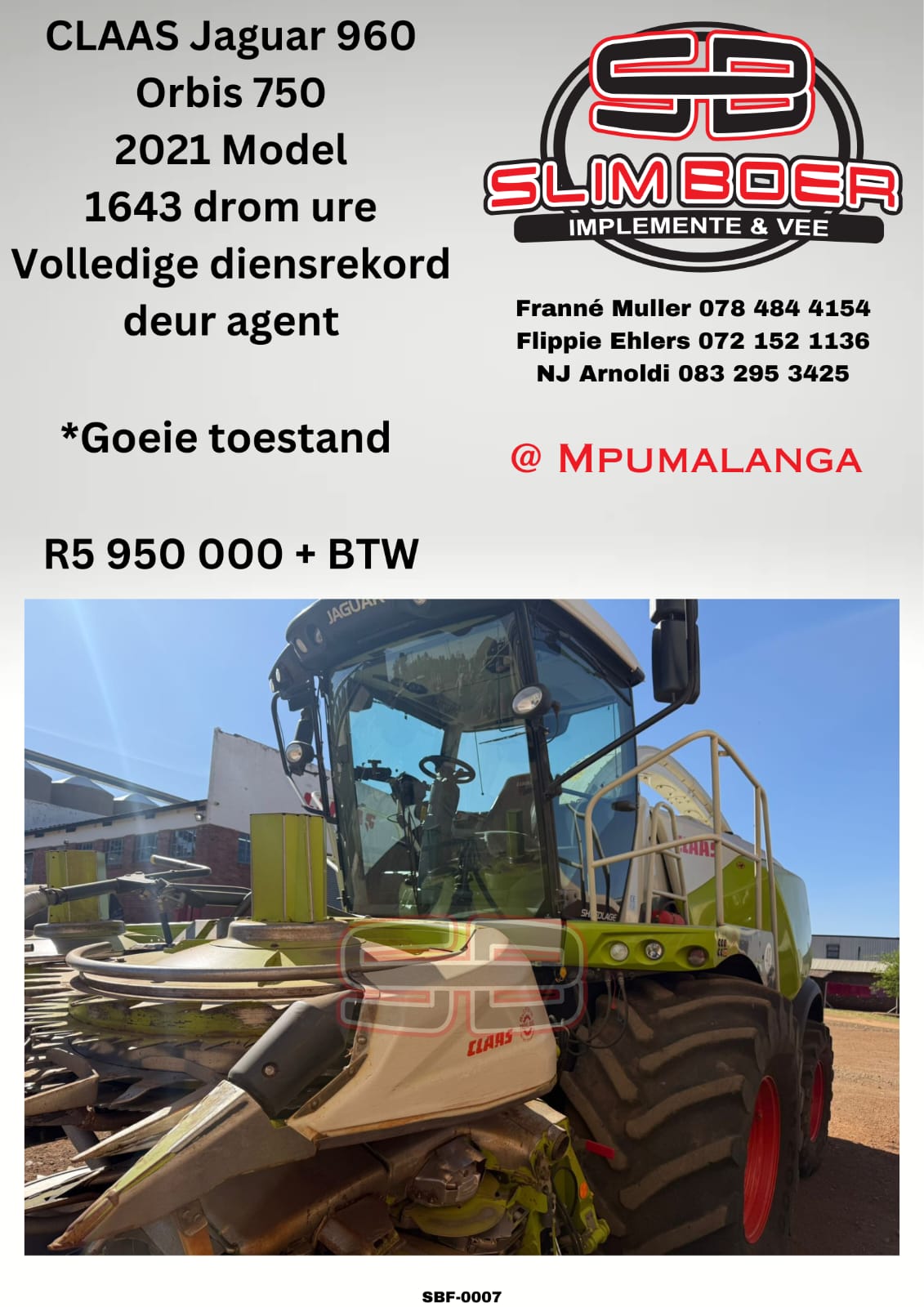 Claas Jaguar 960, Orbis 750, (2021 model), 1643 drom ure, Volledige diensrekord deur agent, Goeie toestand