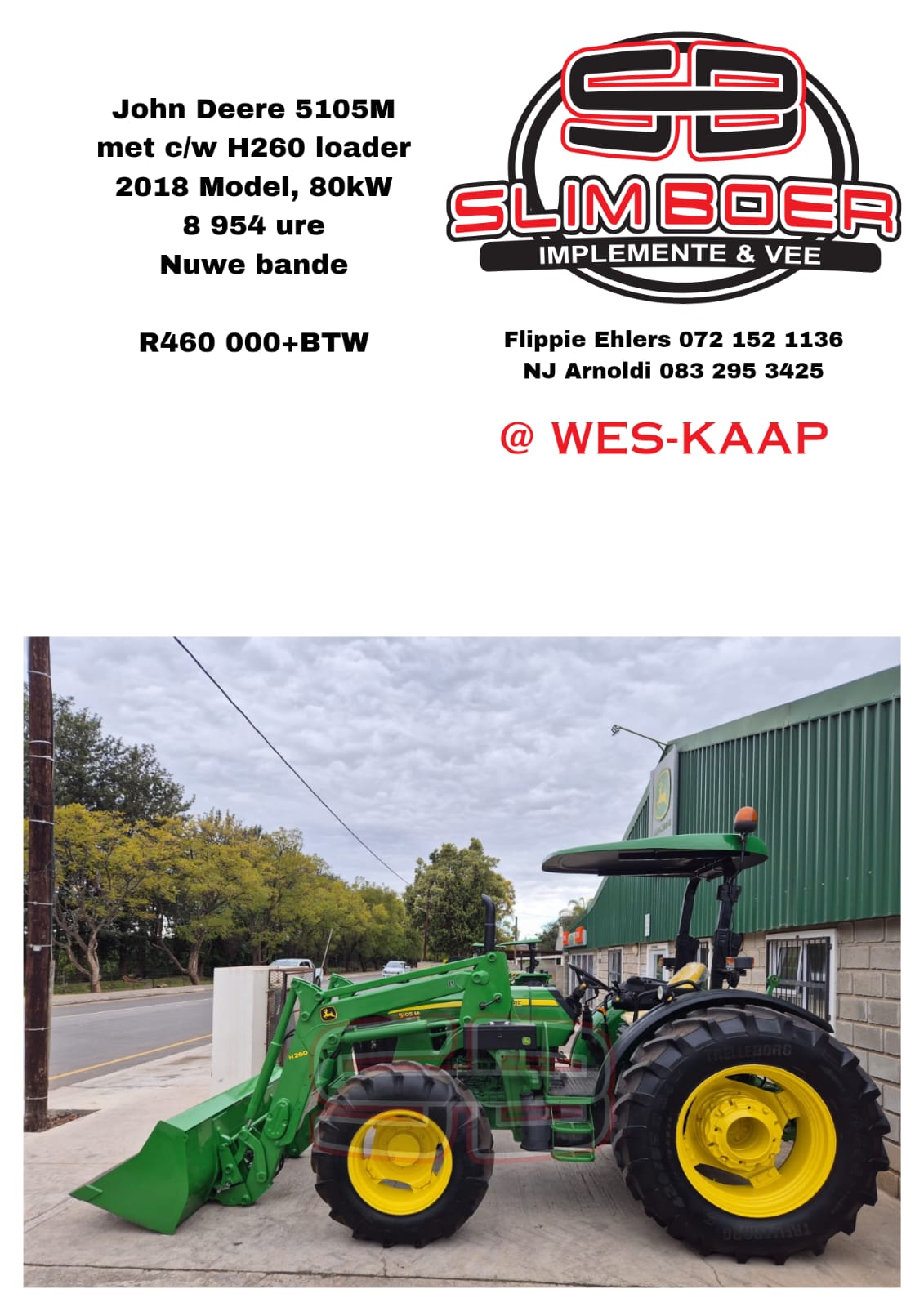 John Deere 5105M (2018 model) 80kW, 8,954 ure, met c/w H260 Loader, nuwe bande